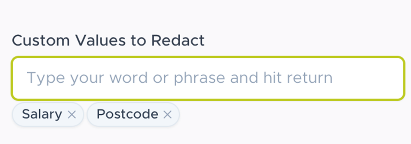 Adding a manual word or phrase is a simple process of typing into the “custom values to redact” box and hitting enter/ return after each entry. Your entries will be shown in the box below and to remove you simply click on the cross to the right of the value.