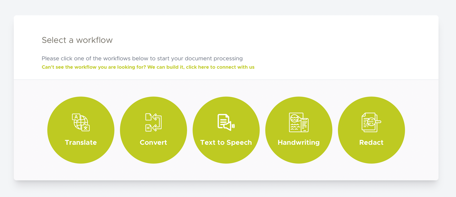 After submitting the document, you will be prompted with the below screen. You can navigate back to your dashboard, choose another workflow, or upload another file.