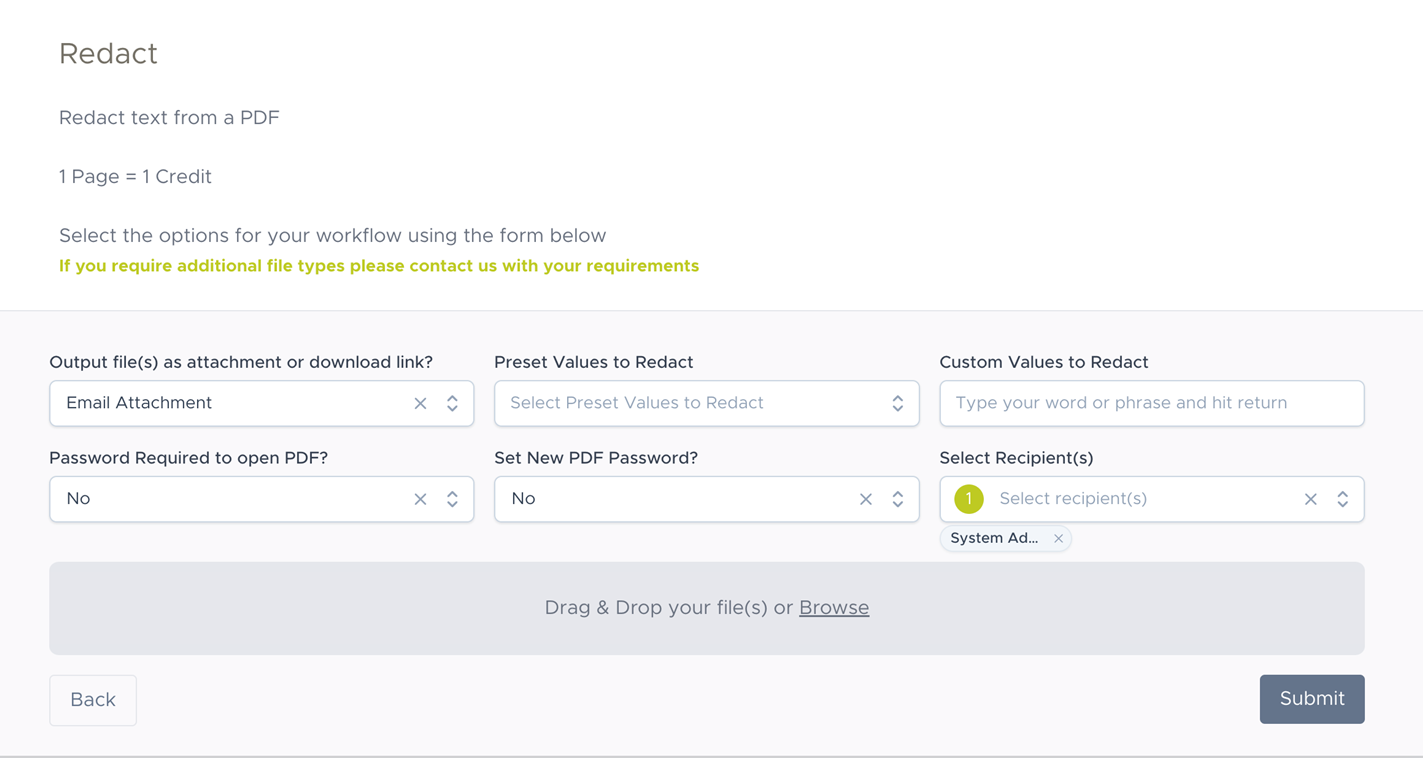 At this stage, you will be given the option to select from one of the many workflows that we have available. Please click on the Redact workflow.