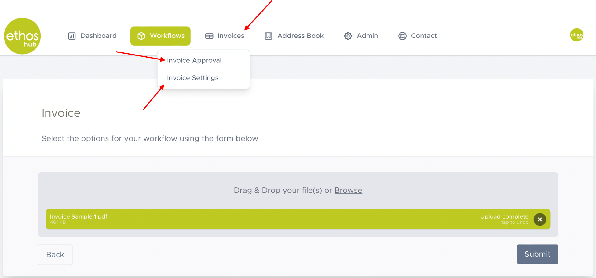 In the top taskbar click on the Invoices tab. You will be presented with a drop-down menu which contains two options. Invoice Approval and Invoice Settings.