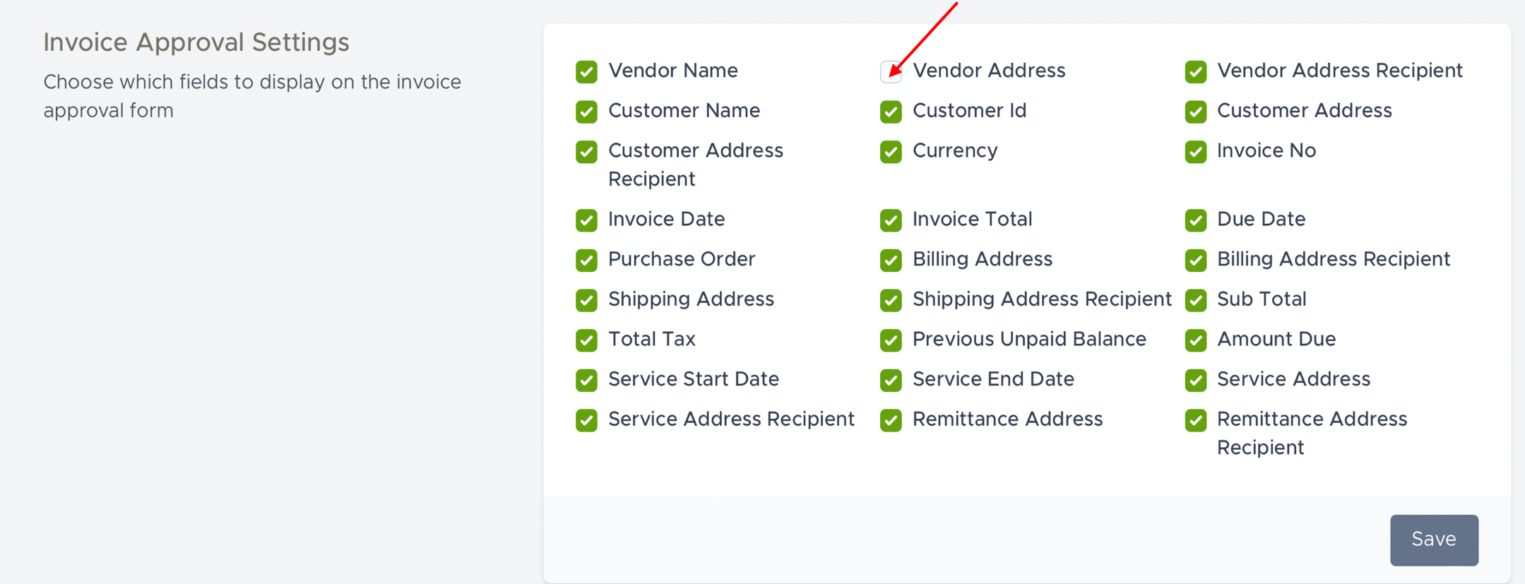 The invoice approval settings enable you to select the fields that you want to display on the invoice approval form. You can check or un-check the fields which apply to you. For example, you may want to hide the vendor address. Simply click on the field to uncheck the box and then click on the save button.