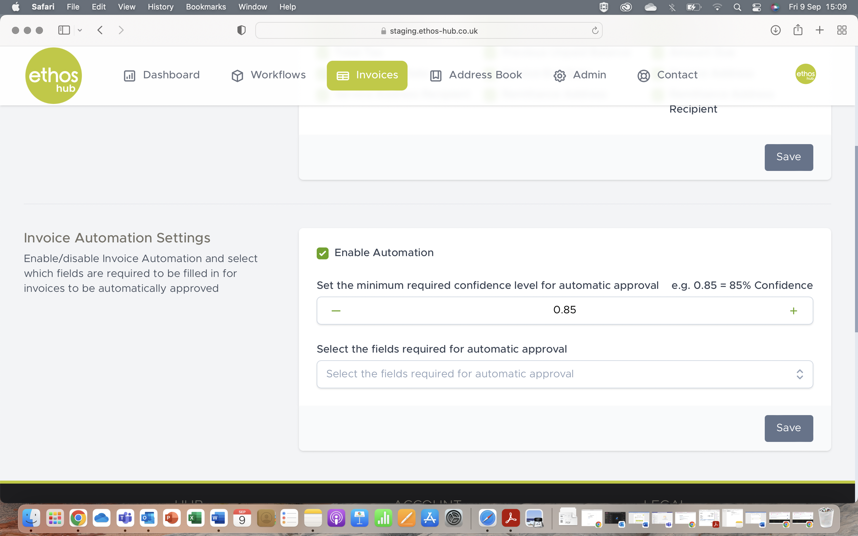 The invoice automation settings allow you to enable or disable which fields are required to be filled-in for your invoices to be automatically approved. Simply click on the enable automation field and you will be given the option to Set the minimum required for automatic approval and Select the fields required for automatic approval.